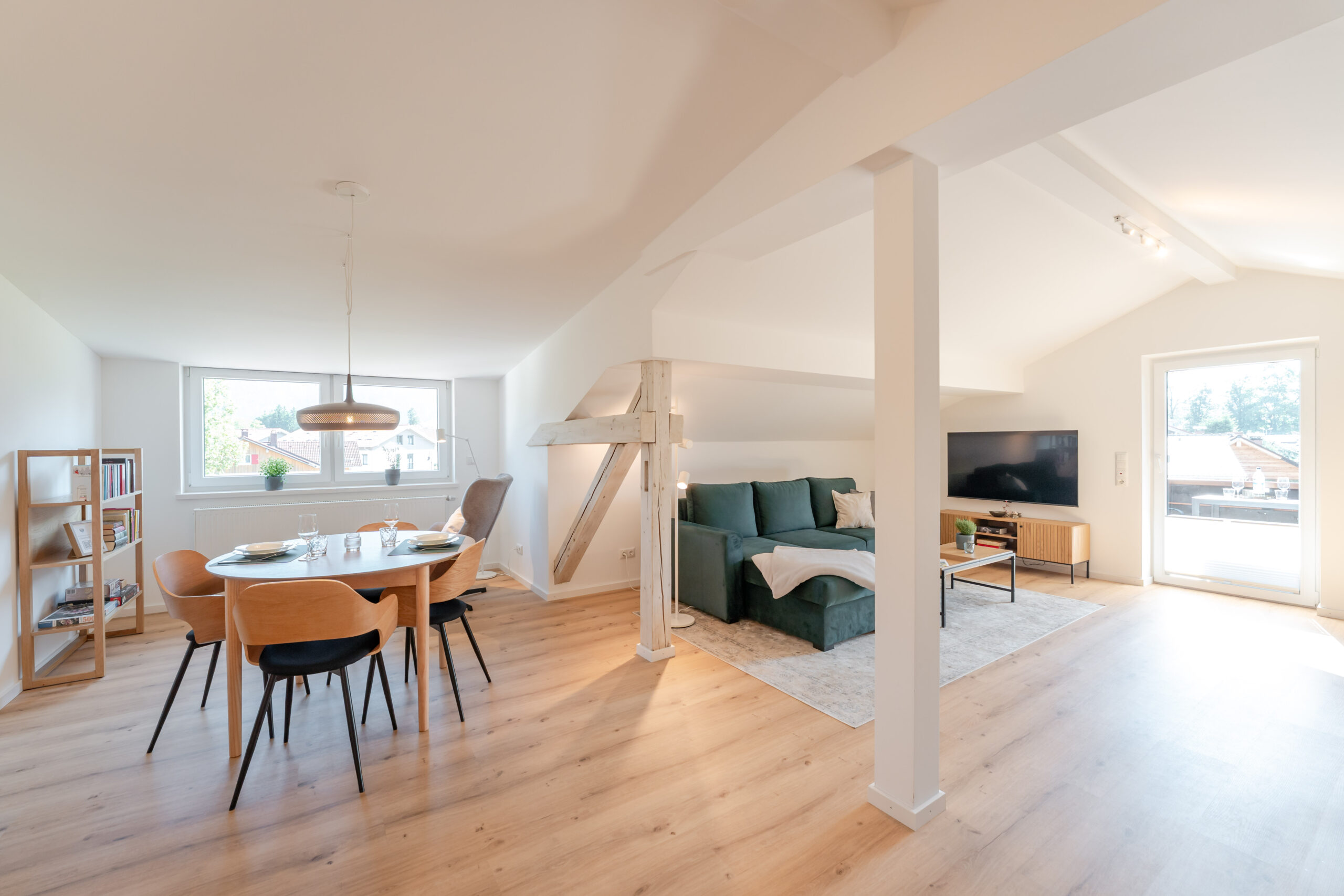 Die gemütliche Ferienwohnung Attlesee im Dachstudio bietet alles für einen entspannten Urlaub. Ein separates Schlafzimmer mit Kingsize-Bett sorgt für erholsamen Schlaf. Die voll ausgestattete Wohnküche mit großem Esstisch, der großzügige Wohnbereich mit Eckcouch und TV sowie das Bad mit Dusche und WC bieten hohen Komfort.